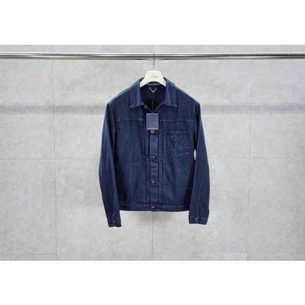 가먼트 다잉 기법으로 다크 네이비 색상을 입혀 빈티지한 워싱 효과를 구현한 타입 II 데님 자켓입니다 클래식한 앞면 플리츠. 모노그램 자수를 장식한 가슴 부분 포켓. 톤 배색을 이루는 진주빛 버튼과 리벳으로 세련된 감각을 더한 디자인 입니다.