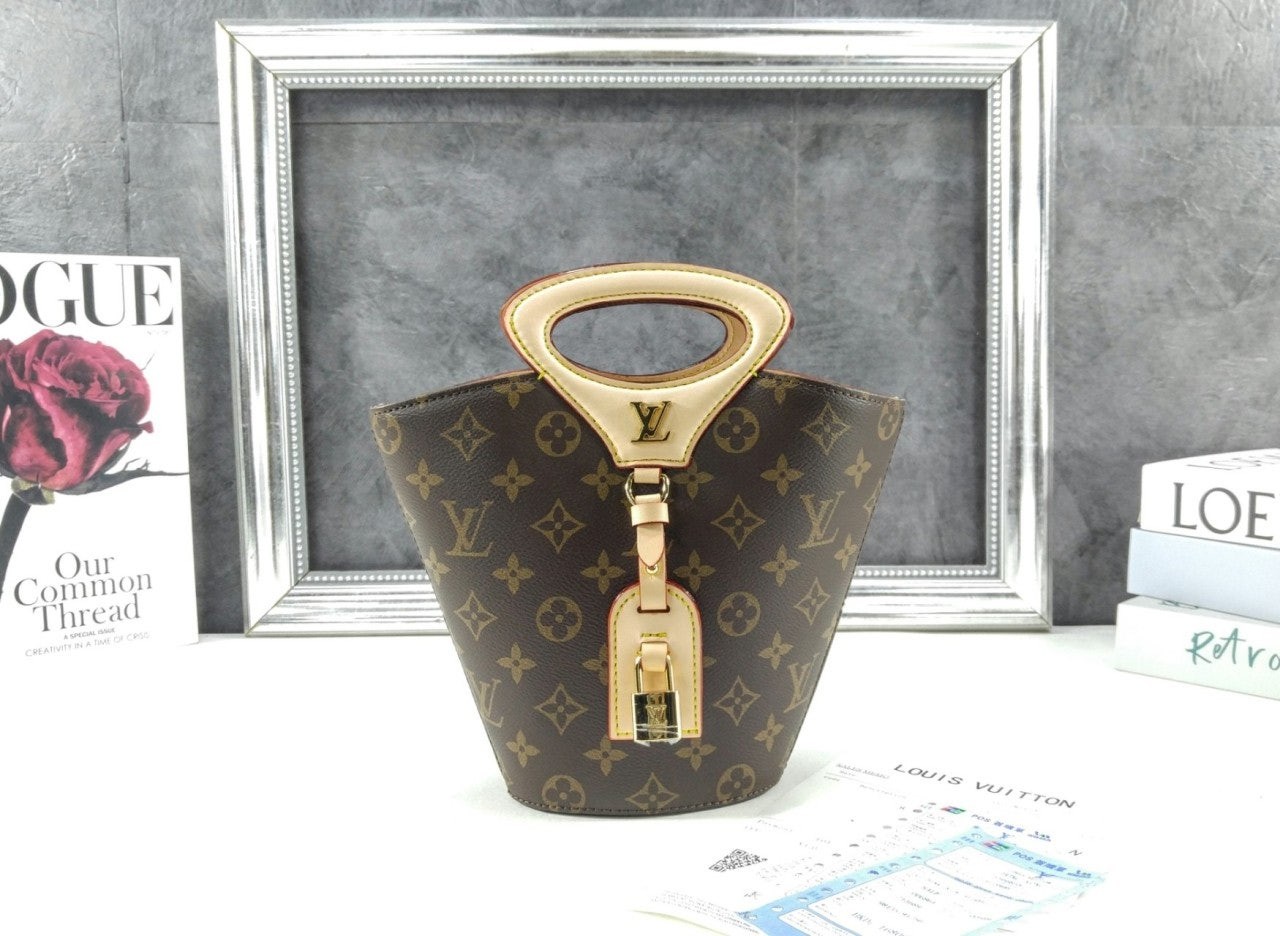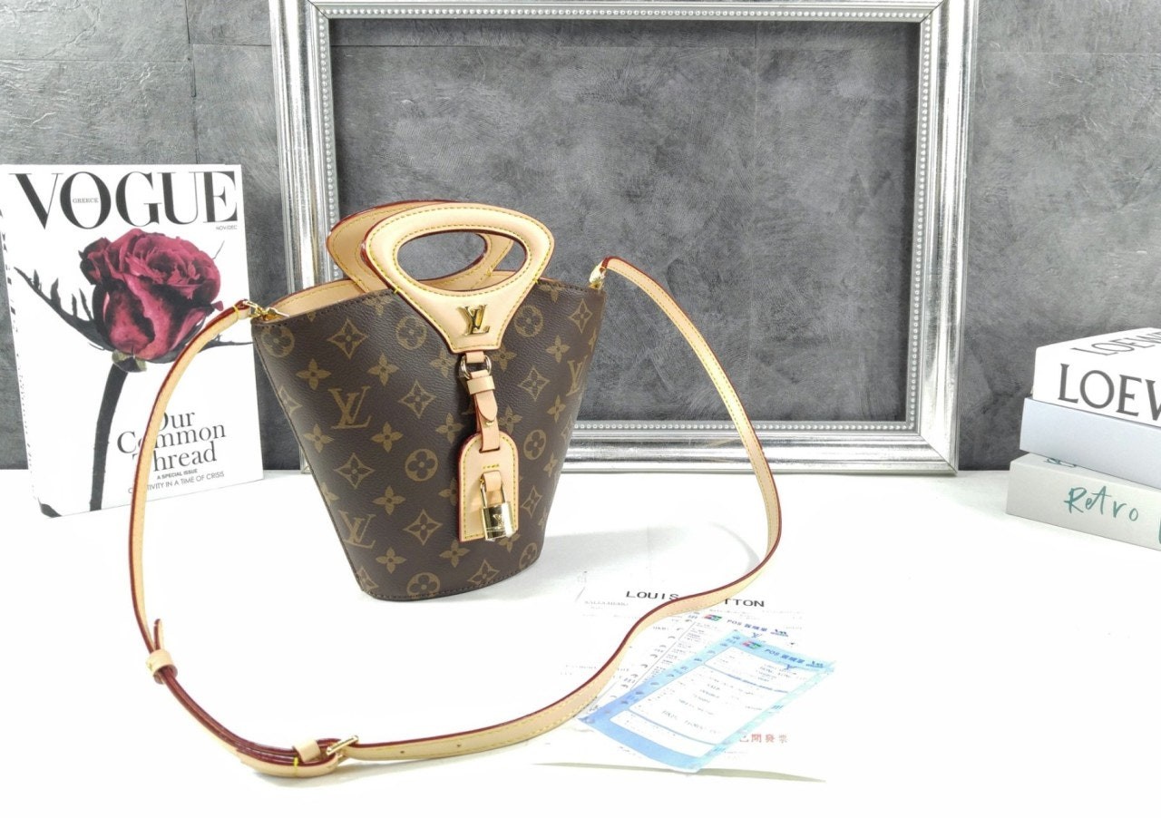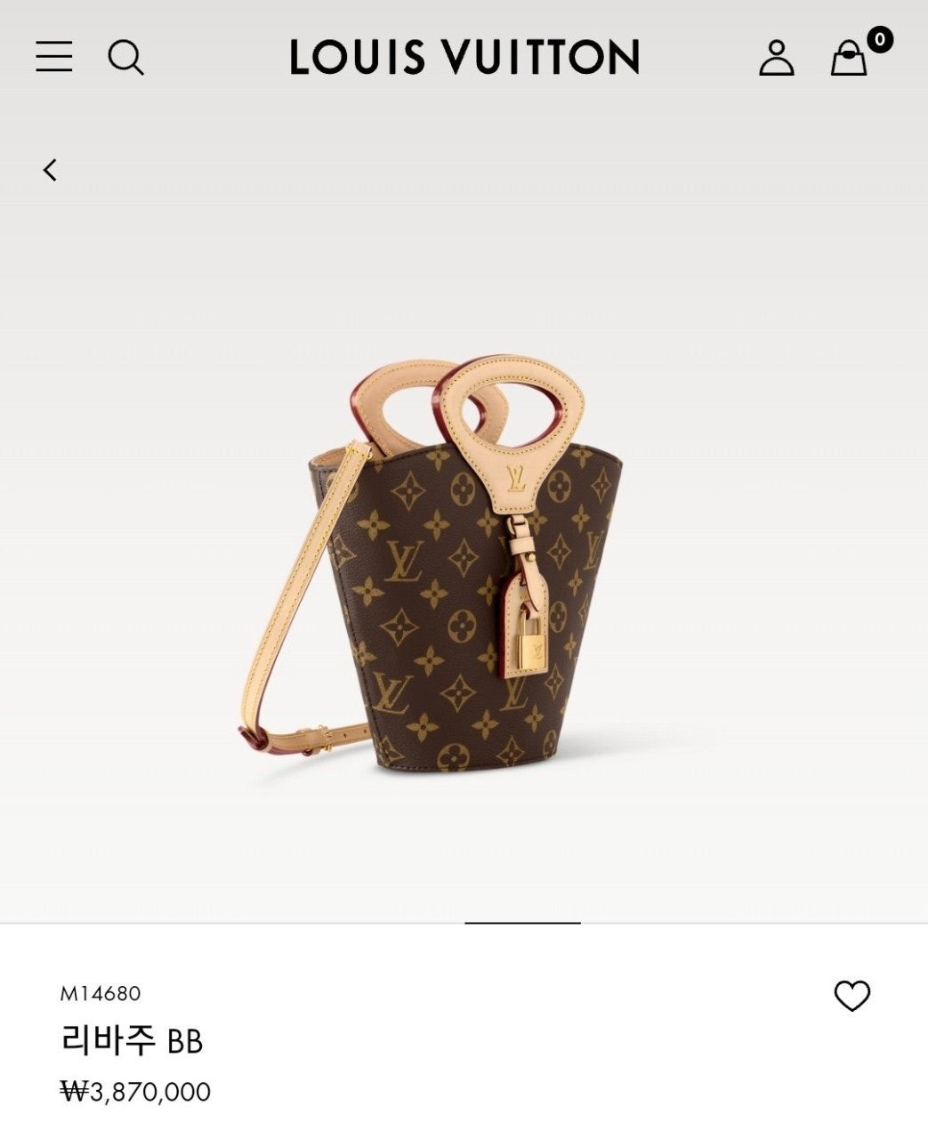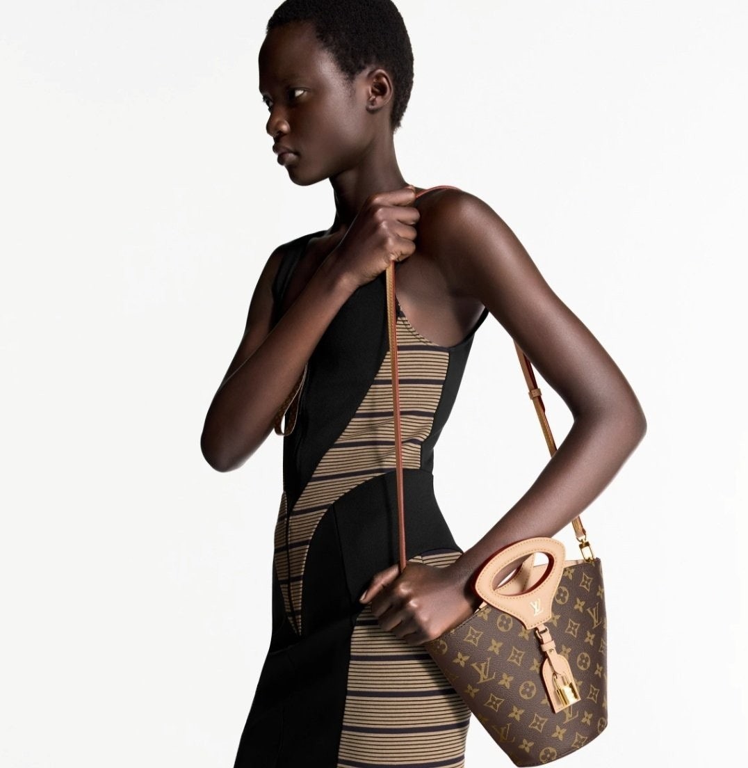 니콜라 제스키에르가 2025 봄-여름 패션쇼에서 선보인 리바주 BB(Rivage BB). 루*의 헤리티지를 기리며 1999년 출시된 녹탕뷜 핸드백을 재해석한 버킷 모양의 실루엣. 트렁크 핸들, LV 각인을 더한 패드락, 가죽 소재의 러기지 택 등 하우스의 다양한 시그니처를 더한 모노그램 캔버스 소재의 디자인. 스트랩을 연결하여 크로스 바디 백으로 연출할 수 있는 아이템.