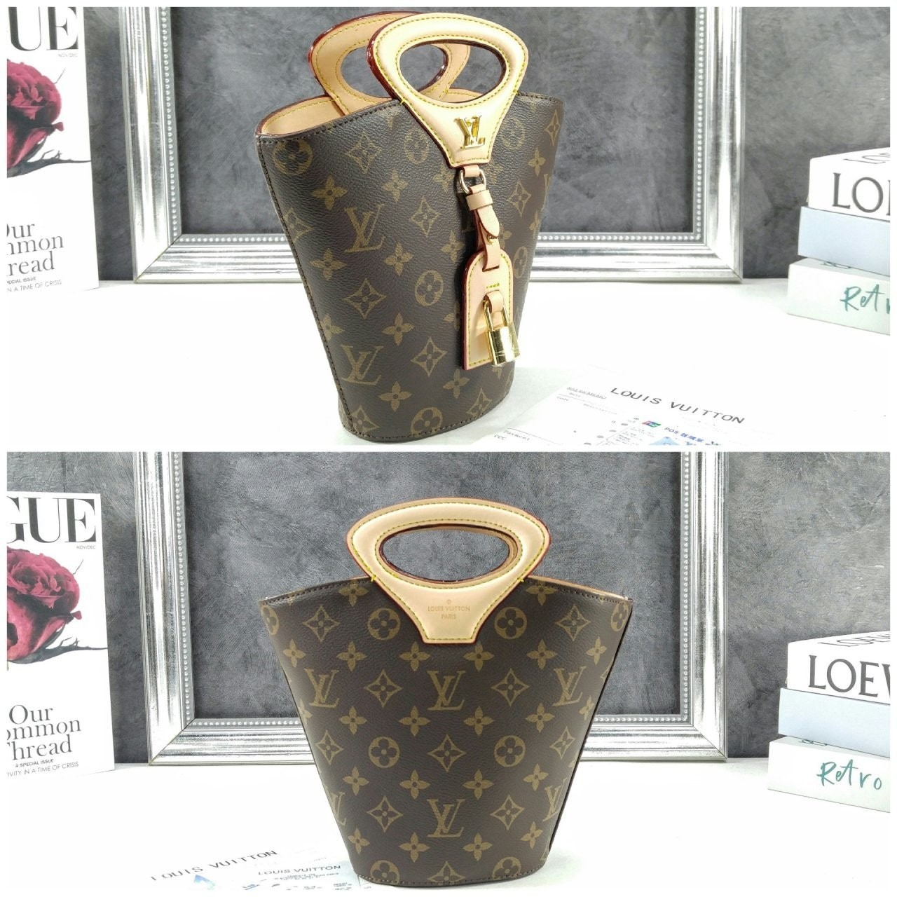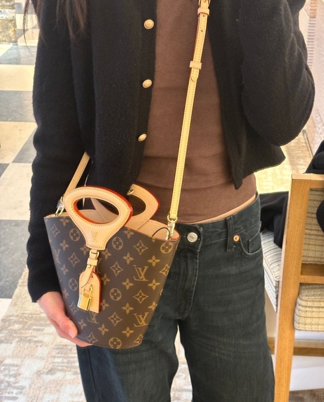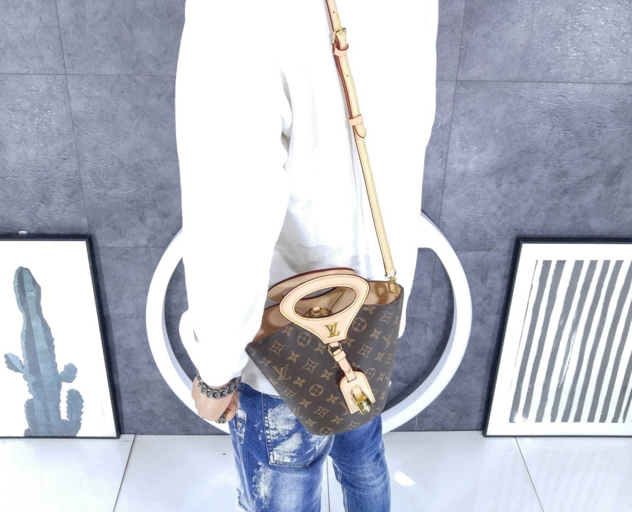 니콜라 제스키에르가 2025 봄-여름 패션쇼에서 선보인 리바주 BB(Rivage BB). 루*의 헤리티지를 기리며 1999년 출시된 녹탕뷜 핸드백을 재해석한 버킷 모양의 실루엣. 트렁크 핸들, LV 각인을 더한 패드락, 가죽 소재의 러기지 택 등 하우스의 다양한 시그니처를 더한 모노그램 캔버스 소재의 디자인. 스트랩을 연결하여 크로스 바디 백으로 연출할 수 있는 아이템.