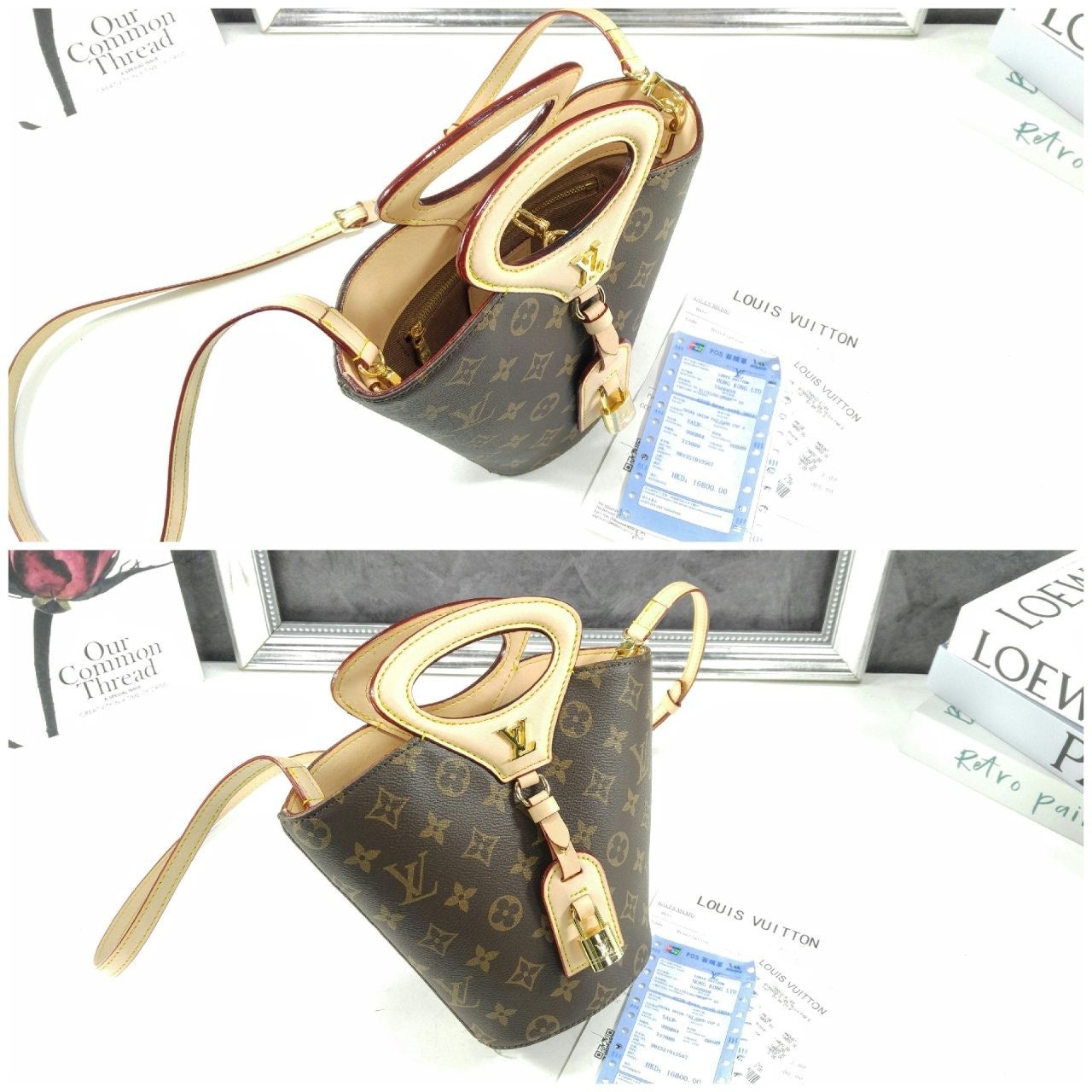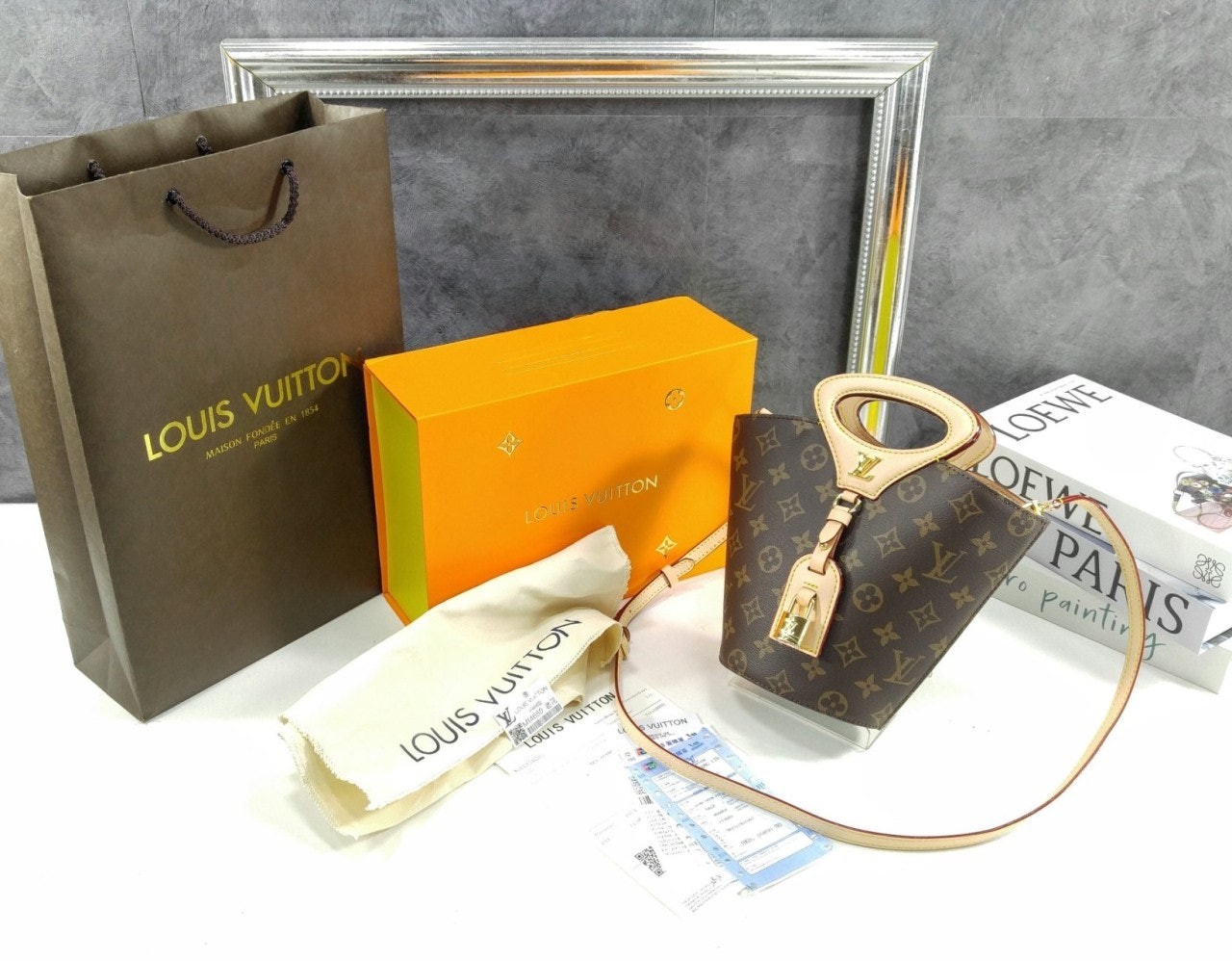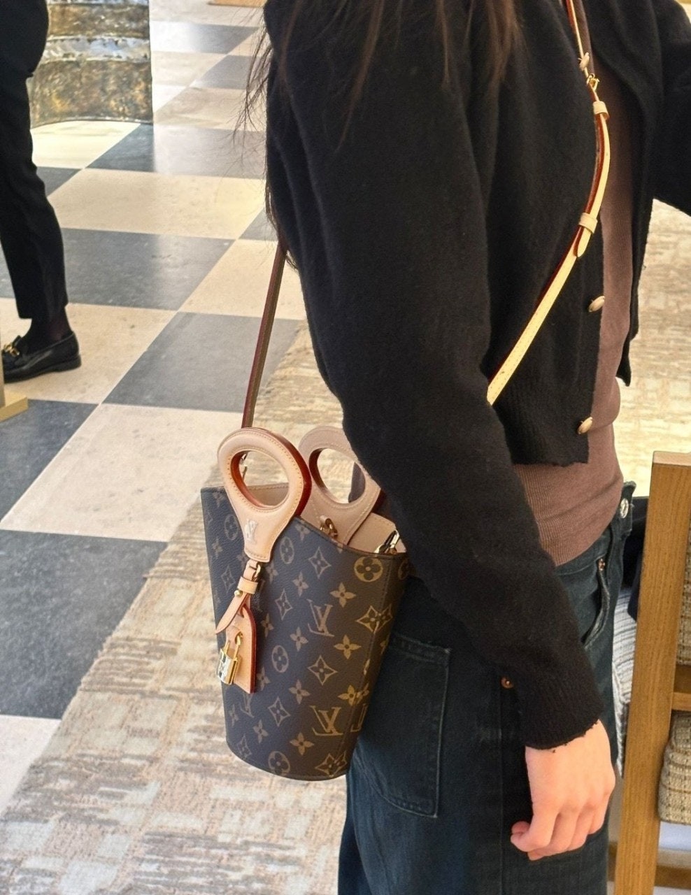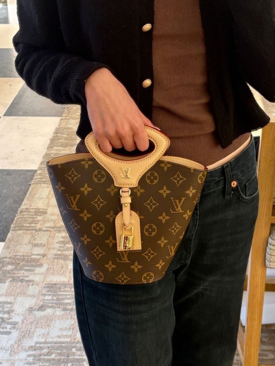 니콜라 제스키에르가 2025 봄-여름 패션쇼에서 선보인 리바주 BB(Rivage BB). 루*의 헤리티지를 기리며 1999년 출시된 녹탕뷜 핸드백을 재해석한 버킷 모양의 실루엣. 트렁크 핸들, LV 각인을 더한 패드락, 가죽 소재의 러기지 택 등 하우스의 다양한 시그니처를 더한 모노그램 캔버스 소재의 디자인. 스트랩을 연결하여 크로스 바디 백으로 연출할 수 있는 아이템.