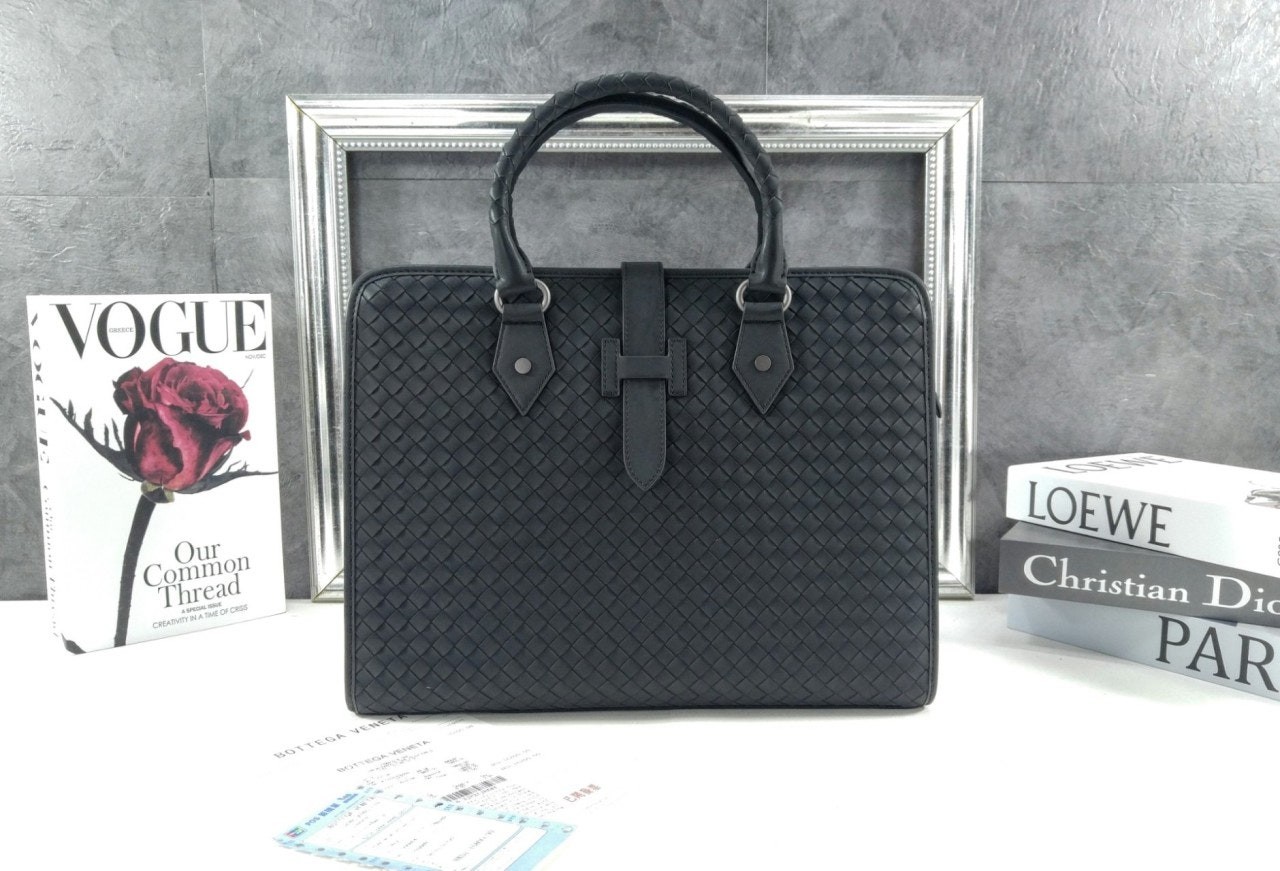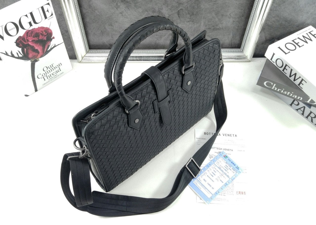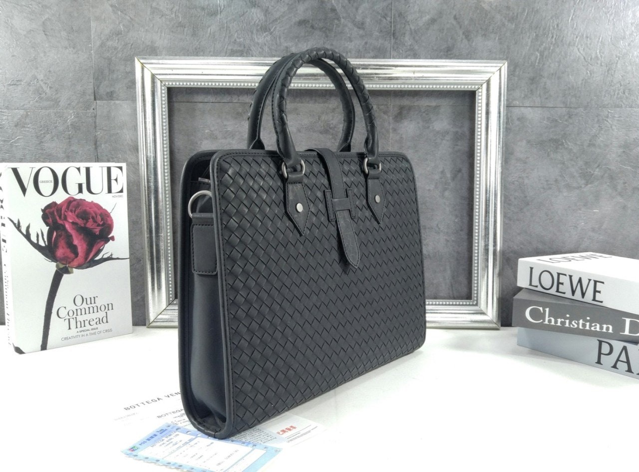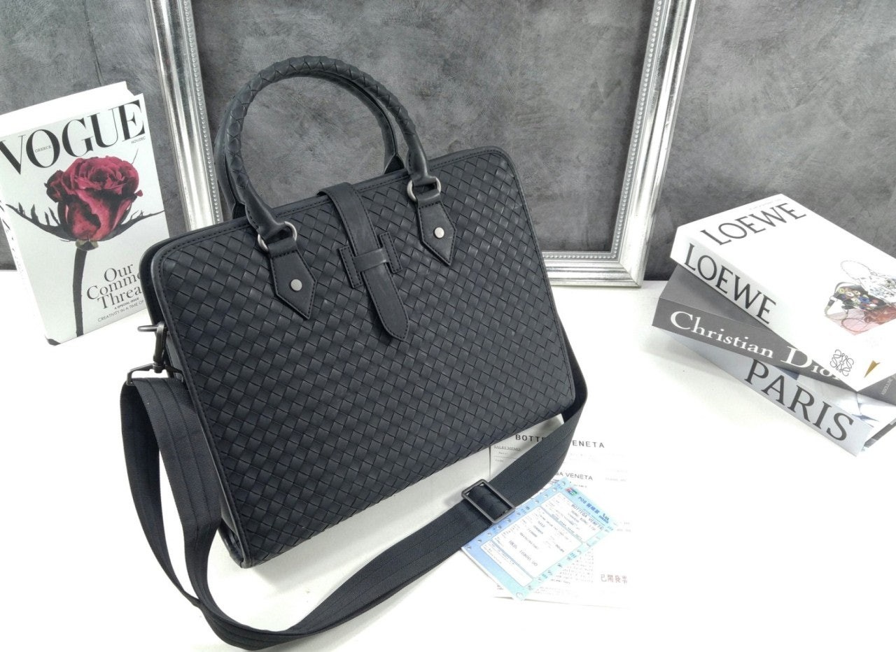 길이 조절 및 탈착 가능한 스트랩과 시그니처 놋 디테일을 갖춘 부드러운 인트레치아토 소가죽 소재의 브리프케이스