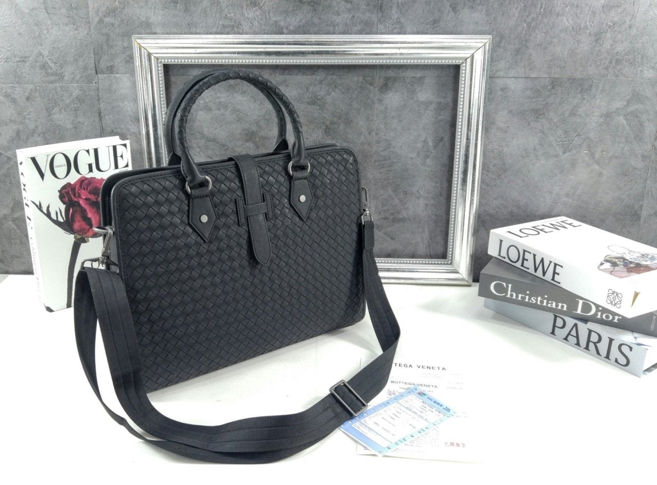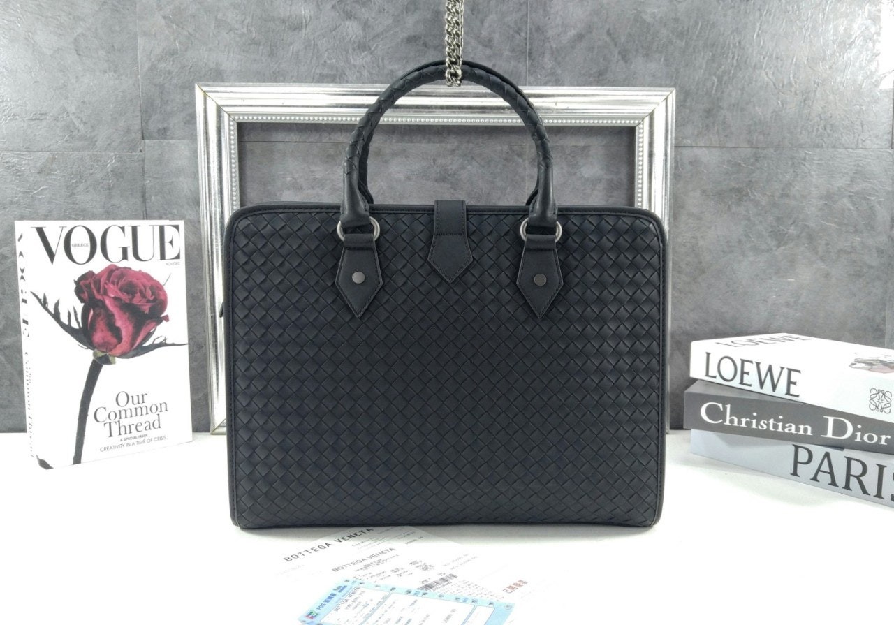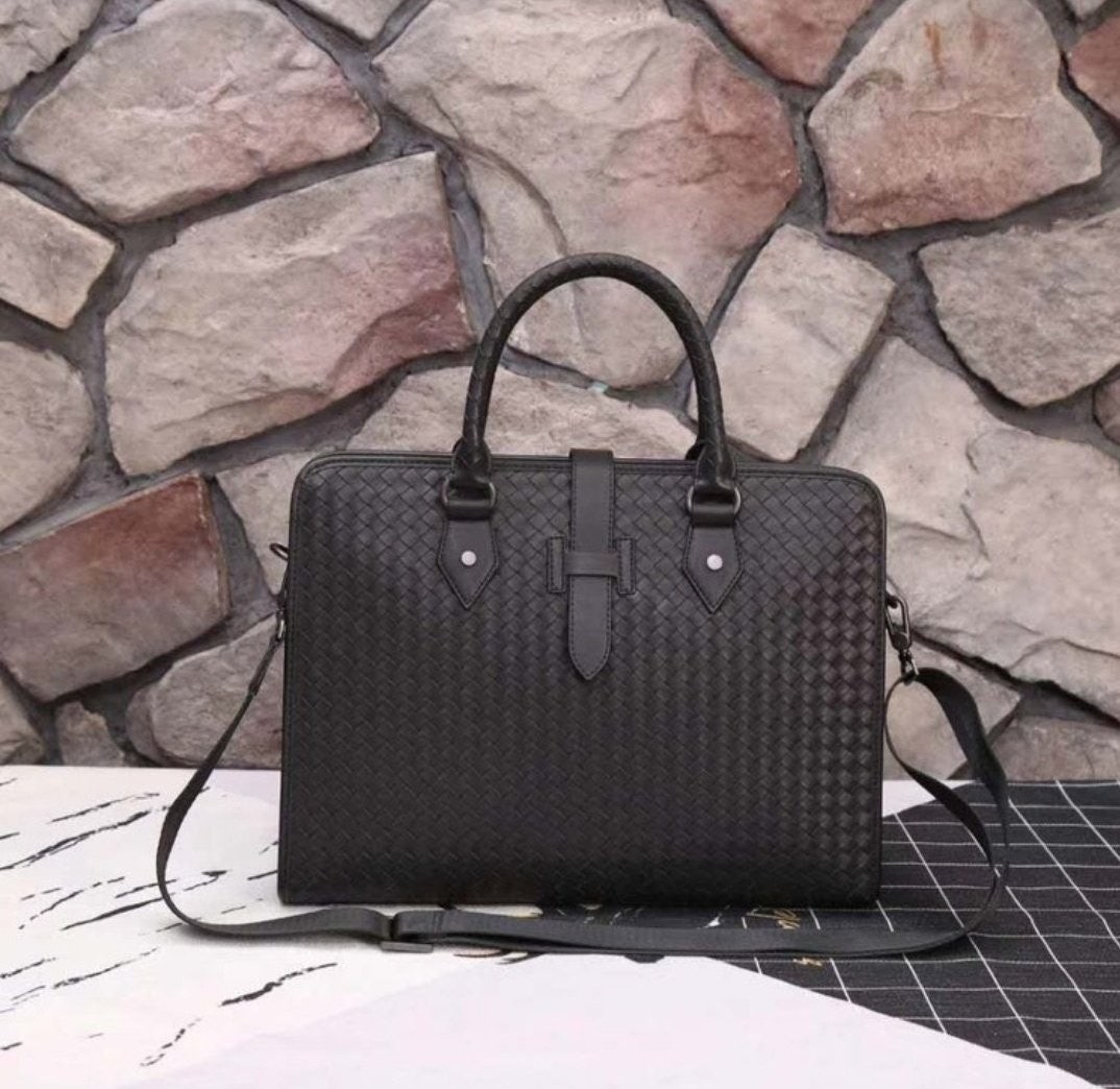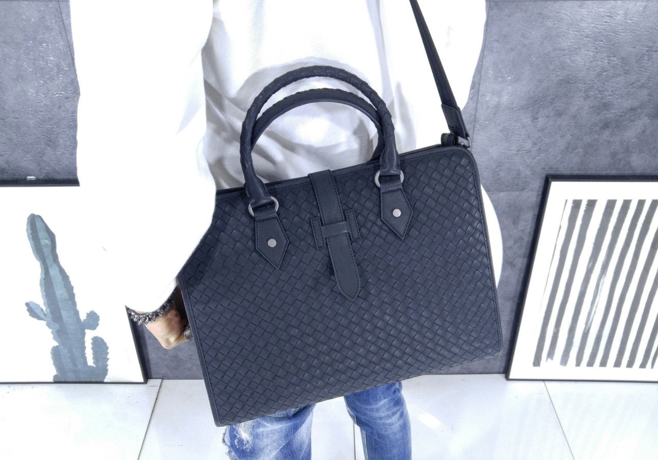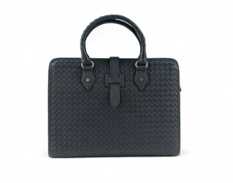 길이 조절 및 탈착 가능한 스트랩과 시그니처 놋 디테일을 갖춘 부드러운 인트레치아토 소가죽 소재의 브리프케이스