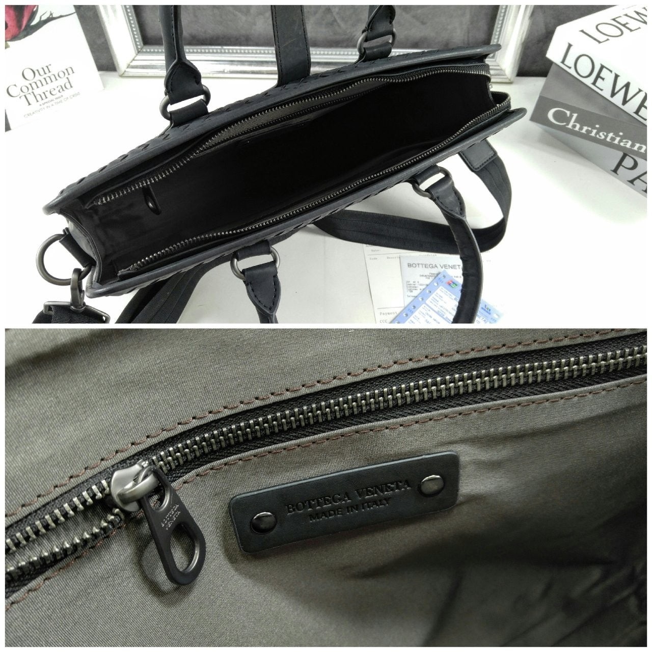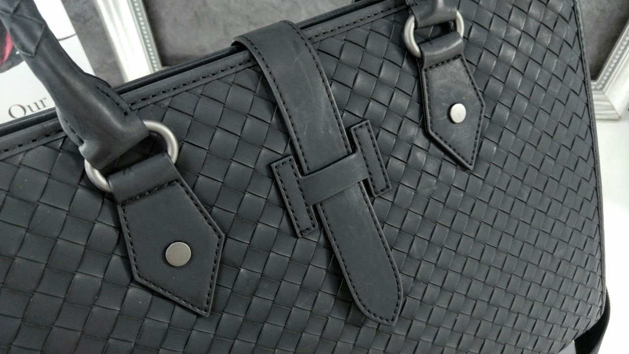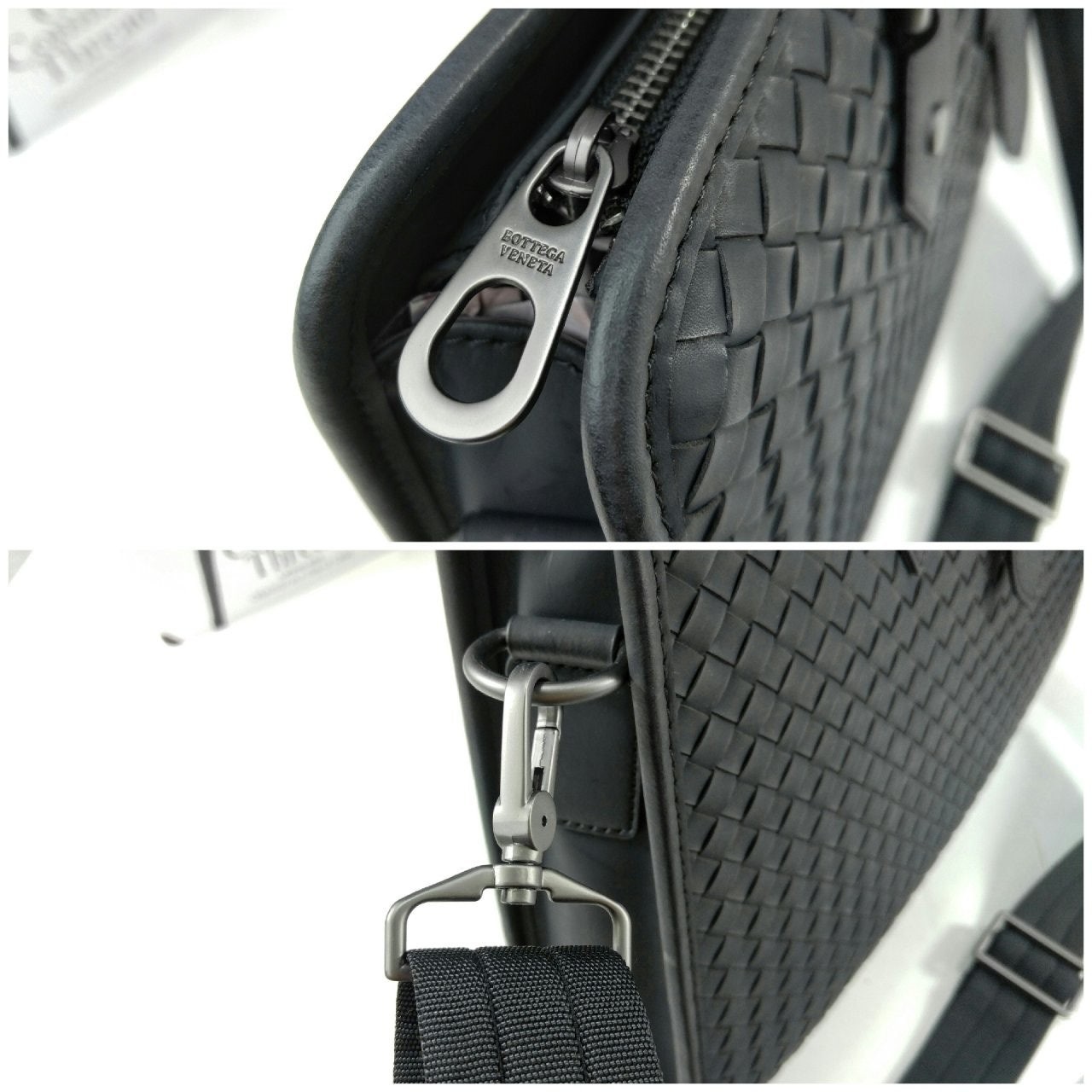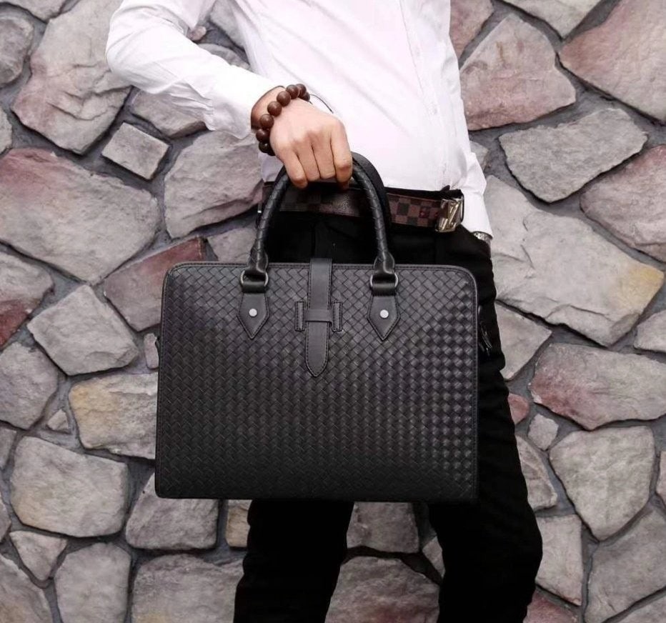 길이 조절 및 탈착 가능한 스트랩과 시그니처 놋 디테일을 갖춘 부드러운 인트레치아토 소가죽 소재의 브리프케이스